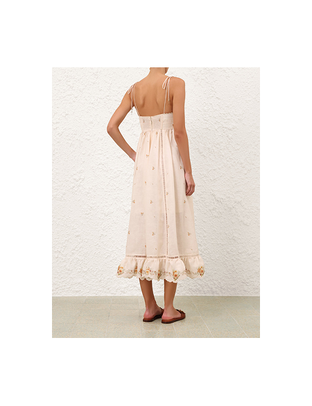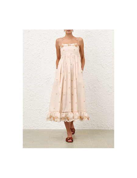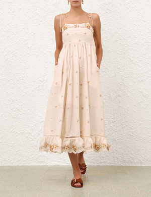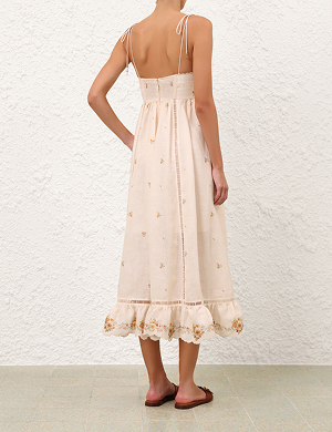 Льняное платье-миди Patience с рельефной отделкой на груди, функциональными боковыми карманами и плиссированной юбкой на подкладке.