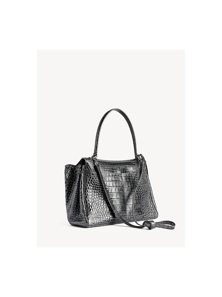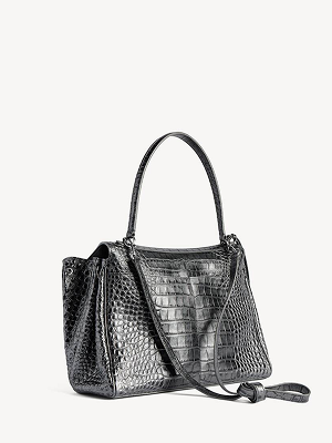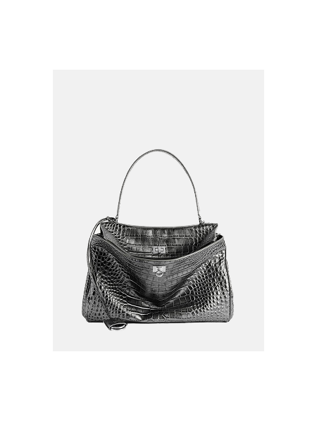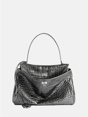 Balenciaga Rodeo выполнена из кожи с тиснением под крокодила в серебристом оттенке с металлическим отливом. Эксклюзивная модель сочетает выразительную текстуру и лаконичную форму, благодаря чему становится акцентным элементом современного гардероба.